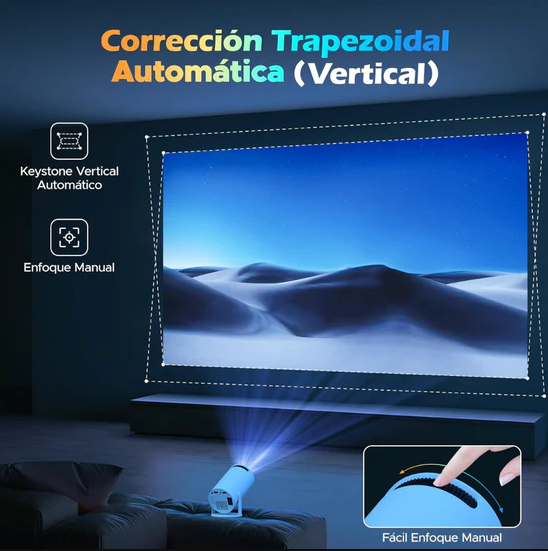 Olvídate de imágenes torcidas. El proyector ajusta automáticamente la proyección para que siempre esté perfectamente alineada, sin importar el ángulo.